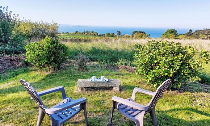 "Ti Loïk", 5-room house 100 m2 on 2 levels. Bright, beautiful and cosy furnishings: 1 room with 1 french bed (140 cm, length 190 cm). Dining room with dining table and wood-burning stove. Exit to the garden. Open kitchen (oven, dishwasher, 3 induction hot plates, toaster, kettle, microwave, freezer, electric coffee machine). Shower, sep. WC. Upper floor: living room with sloping ceilings with rooflight with 1 double sofabed (140 cm, length 190 cm), TV, radio, CD-player, hi-fi system and DVD. Walk-through room with 1 french bed (140 cm, length 190 cm). Interconnecting room with 2 beds (90 cm, length 190 cm). Sep. WC. Electric heating. Terrace furniture, barbecue (portable), deck chairs (4), box-room. Beautiful view of the sea. Facilities: washing machine, iron, children's high chair, baby cot. Internet (WiFi, free). Please note: non-smoking house. Smoke alarm.
