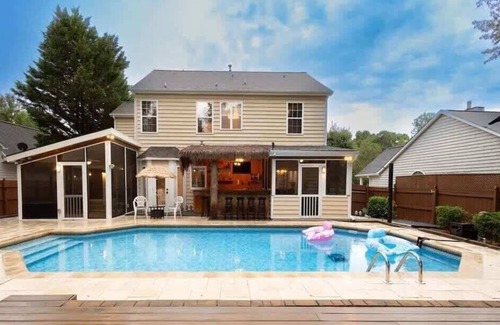Come stay at Charlotte's ultimate staycay home featuring 4 separate outdoor areas surrounding an amazing pool. Also literally around the pool are a tiki bar, outdoor kitchenette, grill, & fire pit. The location is perfect as it’s just minutes to the Charlotte Motor Speedway, PNC Amphitheater, Concord Mills Mall, University City area and less than 20 minutes to uptown Charlotte. Conveniently located right off I-85 and 485. Enjoy 2 living rooms, 6 dining areas, 4 themed bedrooms, & a game room.