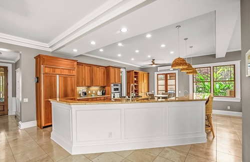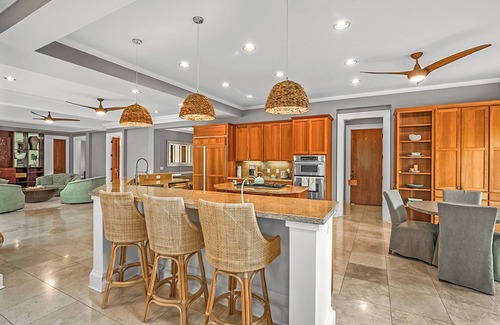 The chef's kitchen is open and ready for you to prepare those island inspired meals for the whole family to enjoy! The kitchen features a Sub Zero fridge, new undercounter ice maker, 5 burner gas range, BBQ lanai, breakfast bar, two sinks and every appliance you'd need including an ice maker! We also have a chilled wine room for all of your sips. Enjoy your mai tai on the lanai, in the pool or on our gorgeous chaise lounges!