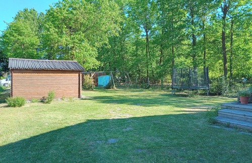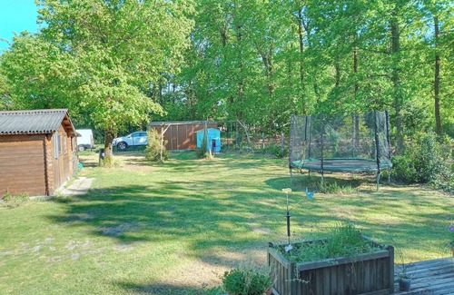 - a garden with slide, swings, ping-pong table, deck chairs, garden table, hammock, trampoline, swimming pool, outdoor games (snowshoes ...)