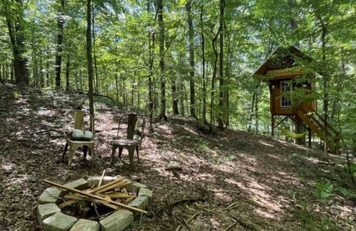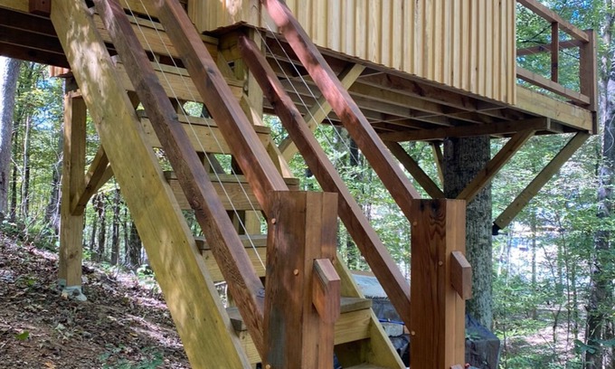 Welcome to our beautiful timber-frame treehouse! Hand built by local master carpenter David Green, this is truly a work of art. It is a two-story dwelling with two porches, lofted bedroom (with queen bed) living room and kitchen/prep area.