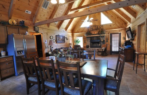 Welcome to Timber Mountain Lodge, a charming cabin that serves as the ideal backdrop for your wedding celebration. Nestled in the heart of Ridgedale, Missouri, this stunning lodge boasts a romantic ambiance and spacious accommodations for you and your loved ones. With its vaulted ceilings and inviting stone fireplace, Timber Mountain Lodge creates an enchanting atmosphere where memories are made and cherished. This lodge is designed not just for relaxation but also for hosting intimate gatherings, making it a perfect choice for couples looking to say "I do" surrounded by nature.