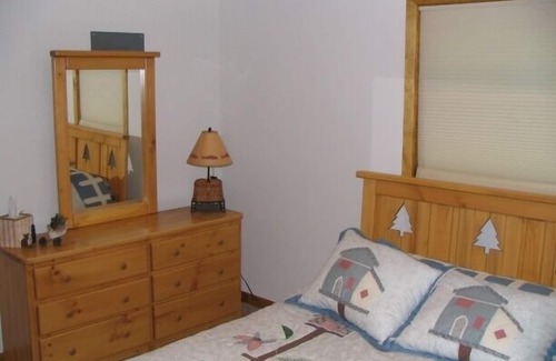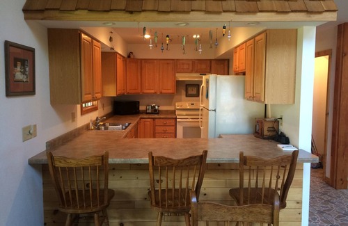 The 'Timber Wolf Lodge' is a northwoods rental unit constructed new in June of 2004. It is a two bedroom, two bathroom unit with an upstairs loft providing additional sleeping space. Both bedrooms have a queen size bed. It is a very spacious rental lodge and also offers a sleeper sofa in the living room. Kitchen appliances and accessories, WIFI, Cable TV, DVD player, Bluetooth Sound Bar and microwave are included. This northern Wisconsin rental lodge also has a beautiful fireplace, snack counter with bar stools and its own private deck with patio furniture and grill. Sorry, but no pets are allowed.