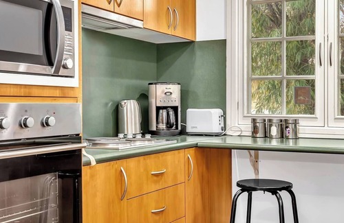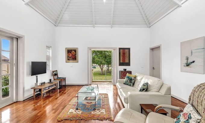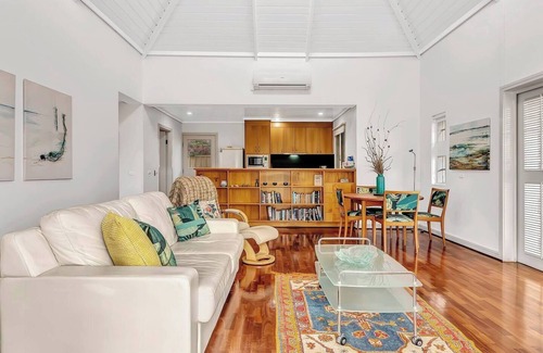 Arriving at this property you will instantly be enamoured by its charm. The open plan living area features high ornate ceilings with French doors opening to the outdoors, where you can sip your morning coffee out on the patio before taking a quick stroll down to the water’s edge. The whole space has beautiful air flow and natural light, plus air conditioning. There is comfortable sofa seating, plenty of books and a central TV with Netflix for your evening entertainment. A dining table encourages guests to whip up a meal and dine at home, making use of the full kitchen.