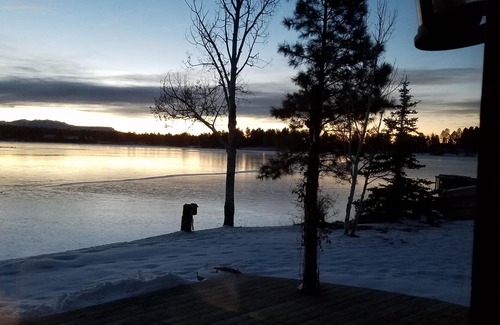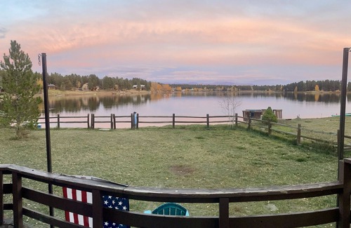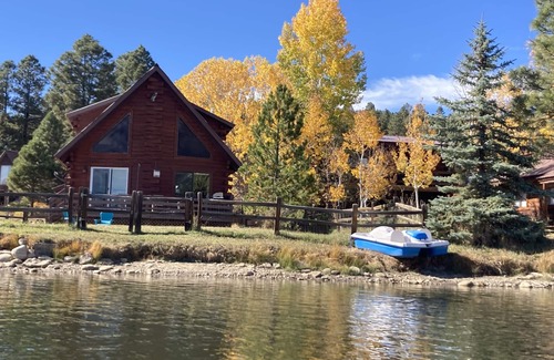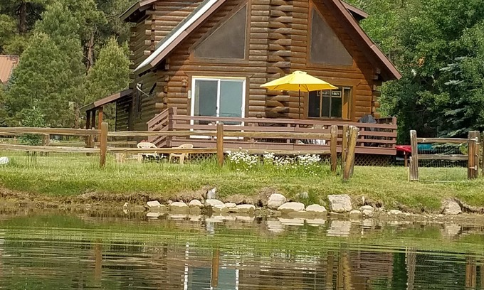 Lakefront log cabin with two bedrooms and two bathrooms. Open floor plan, mountain views, deck, loft bedroom with king sized-bed and gas fireplace makes this a magical Colorado experience. Downstairs queen bedroom. Fenced yard keeps your pets and kids safe. Fishing right in front of the house! Paddle boat and kayaks provided.