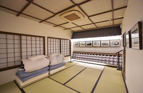 Hiroshige Utagawas One Hundred Views of Edo can be seen on the gold fusuma in the bedroom and when you look up you can also see the painting on the ceiling