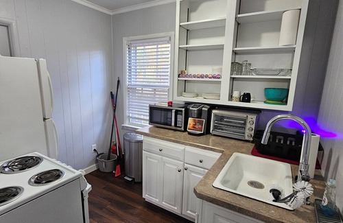 The 6 large bedrooms in the main house exude old-world elegance with high ceilings, crown molding, and wood floors. Each bedroom offers a memory foam mattress, 55” 4K Smart TV, individual mini-split A/C unit, and a cozy fireplace with faux log heaters, allowing you to control the perfect climate. The main house also includes multiple living areas: gather in the family room with its 65” 4K Roku TV, enjoy quiet moments in the historically styled living room, or work remotely in the office/morning room with two fully equipped workstations.