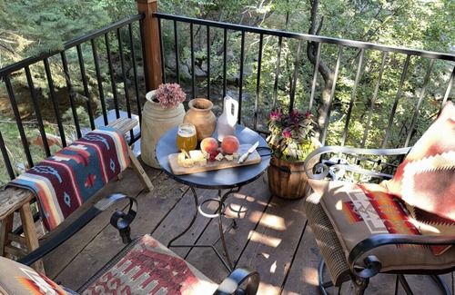 Upstairs has one half bathroom and sleeping loft with two twin beds, and one king bedroom with a spacious and uniquely Sundance bathroom, and private deck overlooking the stream.
