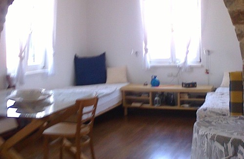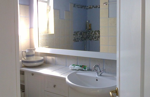 Main property comprises of a bedroom in the basement with a double bed. Bedroom covered with stone. In the basement we also find the living room with the kitchen, the main bathroom and stairway to first floor. Not to forget the fireplace. On the first floor we find the second sleeping area with two single beds and its own aegean bluecoloured bathroom. Terraces all around lead to the external fully ecquipped separate studio (different level - independent), for two people in twin beds, separate kitchen and bathroom. The studio entrance is about 10 meters from the main entrance in a different level. Please note that the studio remains closed when the rental is targeted for up to (4) people except if otherwise agreed.