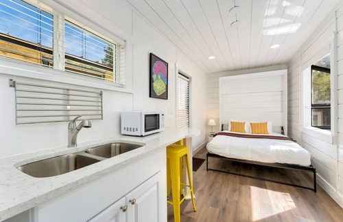 Tiny 1, Cameron Peak, is a lovely mountain respite. The space inside may be small, but that didn't stop us from getting a queen sized bed and a kitchenette (complete with microwave and mini-fridge) in there. This tiny home even has its own bathroom WITH a shower, the tiniest shower you ever did see! If you want extra space to move around while you're getting clean, no worries, we have an awesome shower house right next door for your use. Tiny 1 has heat and air conditioning. Enjoy the mountain atmosphere with a bonfire at one of our 3 community fire pits, or cook out at our community deck featuring two large propane grills and a propane pizza oven. Don't feel like cooking? Grab a quick snack from Poudre Park Market or Kind Bean (the airstream we turned into a coffee cart).