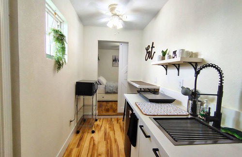 Explore the allure of our studio, a cozy tiny home situated on the left side of our property. Enjoy the convenience of a fully equipped kitchen. Perfect for Disney, Legoland, and Universal Studios adventures, as well as quick beach getaways. Close to shopping and dining for family fun. Designed for productivity with high-speed internet, a compact workstation, and vibrant lighting. Uncover the magic of your exclusive tiny home experience!
