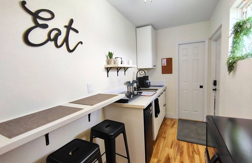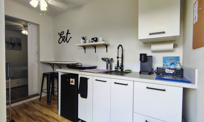 Indulge in the exclusive features of our studio, accessible through a private entrance. The kitchenette boasts an induction cooktop, mini fridge, Keurig coffee maker, blender, pots, pans, and complete dishware. The bedroom offers a full bed with trundle, accommodating up to 3 guests. Entertainment is at your fingertips with a 40-inch Smart TV featuring Netflix, complemented by provided bed linens, blankets, and pillows.