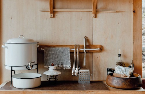 This is elevated camping setup. The “kitchenette” is equipped with microwave, electric kettle and electric burner, there is also outdoor charcoal grill, there is no sink. The only source of running water is the outdoor shower.