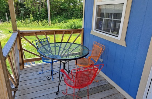 We are just off I-29 in northern Missouri between St. Joseph and Platte City.This tiny cabin is across the driveway from our house on flat ground. Our property is21 acres and includes a yard of 6 acres and fields (alternating corn and soy beans) and a wooded area. There is a fishing pond down the hill behind our house. There is also a fire pit to the left (north) of the cabin. Around the fire pit are swings and benches. We call this area Geriatric Park. It used to be a playground for our grandkids, but when they outgrew it we adults took it over!