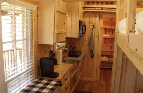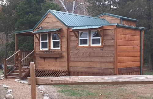 The new tiny cabin is 418 sq ft with unique sleeping loft with full size bed accessed by ladder. On the main level full bathroom, fully stocked kitchen, and bunk beds if you prefer. Large front porch overlooking river, fire pit, and outside eating area.