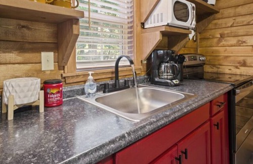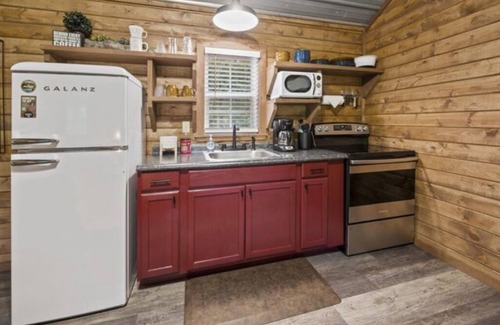 “Playin’ Hooky” is a cute little tiny cabin conveniently located on the road going into the park at the North end of Pine Creek Lake. Less than one mile to Little River Park and the lake. Perfect for going fishing, boating, swimming, kayaking or just taking a stroll at the lake. Cozy and Ideal for fisherman, a couples getaway or a small family. The adorable kitchen has a retro fridge, microwave and full size electric cookstove.