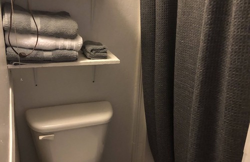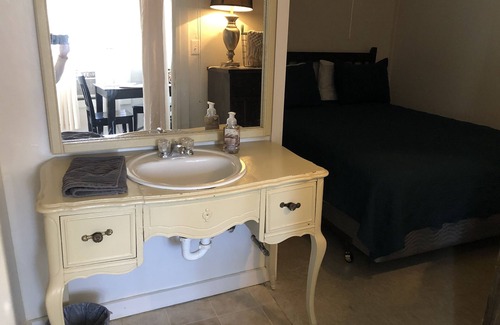 The casita is clean and neat but nothing fancy. The “kitchen” has a two burner stove, a mini fridge and a sink. A queen sized bed and a small bathroom. You can park in our driveway and enter the casita through the gate into the back yard.
