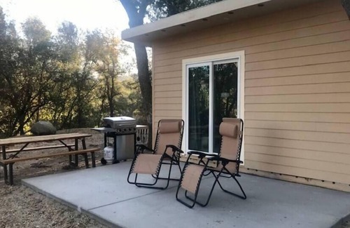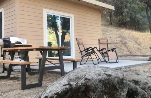 Our brand-new guest cottage is an architect-designed tiny home for 2, in a peaceful rural area. It is just 28 minutes from beautiful Kings Canyon National Park. There is a view of meadows and guests are welcome to stroll the half-mile around the property and view the sheep, dogs and horses. Birdlife is abundant and nearby is Cat Haven ( featuring lions, snow leopards etc.). Besides great hiking in the Park, Yosemite is within reach for a day trip. Sorry, no assistance animals (see house rules) This tiny home has a queen bed, a small table with 2 chairs, and small closet and kitchenette (see photos). In the bathroom is a shower, toilet and vanity. The 9 acre property has a half-mile track on the perimeter that you can walk. On the patio you have relaxing anti-gravity chairs, a picnic table, and a BBQ with an extra stove-style burner in case you wish to cook outside. You have access to the space around the cottage, the perimeter walk, and the cottage itself.
