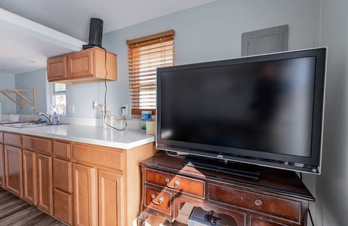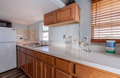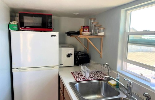This property offers a full size fridge with a freezer, microwave, a four-pot coffee maker, BBQ grill, and toaster oven. There is a sleeping loft with a twin bed and a twin-size futon couch bed in the living room. The home has a beautiful stand-up shower with an incinerator toilet. The tiny house is air-conditioned with a mini-split air system and 3 fans for your comfort.