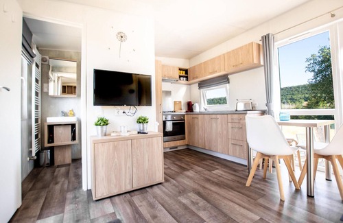 Welcome to this Tiny House in the NATURAMA® Nature Park Resort in Beilngries, in the heart of the Altmühl Valley. Your Tiny Haus is located directly on the water with access to the river right outside the front door. It is functional, modern and furnished with high quality materials. The cozy living area with sofa bed, dining area and well-equipped kitchenette invites you to linger. In the separate bedroom with double bed it is wonderful to sleep and dream. The sofa bed is 170 cm long and therefore only suitable for children. In addition, the Tiny House has its own bathroom with shower / toilet.