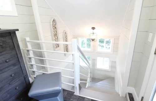 Tiny Home B features a cozy full-sized bed, a smaller futon couch, and a child bunk, comfortably accommodating up to three guests. The second-floor bathroom adds a touch of privacy and convenience. Each home comes complete with its own parking spot and a private balcony or patio, allowing you to relax and enjoy the peaceful surroundings just steps away from your wedding celebrations. Although pets are not allowed for the safety of the farm animals, rest assured, you will have uninterrupted access to the beauty and comfort this tiny home offers.