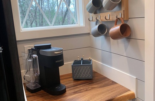 This tiny home has big luxury. It has a full kitchen, living room, closet space, and a queen bed in the loft. The deck is covered and sits on a private spot overlooking the woods. You will love this modern little home away from home. A tiny house on a private little street with 5 different cottages. Each one has its own parking and private space.