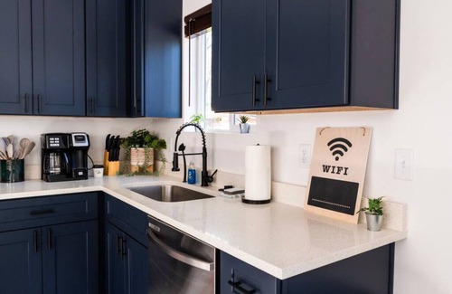 Designed with modern flair and functionality, our tiny home boasts state-of-the-art amenities. Sleep like royalty on a premium DreamCloud mattress in the queen-size bedroom. The full bathroom and kitchen come equipped with brand-new Samsung appliances, including a washer and dryer, making your stay as convenient as it is comfortable. With us living in the adjacent main home during the warmer months, you can rest assured that help, recommendations, or a friendly chat are just a stone's throw away.