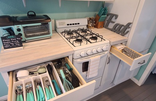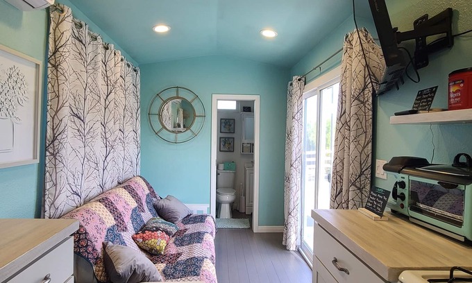 Tiny home has a robot vacuum if you want the place vacuumed while you are out enjoying all San Diego has to offer.