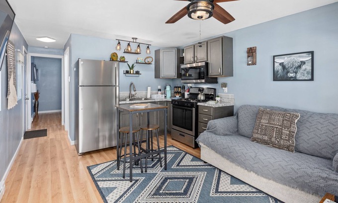 Ever wondered what it’s like to stay in a TINY HOME?! Traveling with a boat, RV, or trailer? Need a pit stop with all the stops? Located just outside of Mulberry Grove, IL off I-70 on private wooded lot. Fully updated and has all the comforts of home! Living room/kitchen, full bathroom, WASHER & DRYER, and 1 bedroom! Queen air mattress for extra guests. Smart TVs, electric fireplace, AC & Heat! Grill and fire pit on site. 15 mins to Carlye Lake & Vandalia Lake! Plenty of parking, RV hookup.