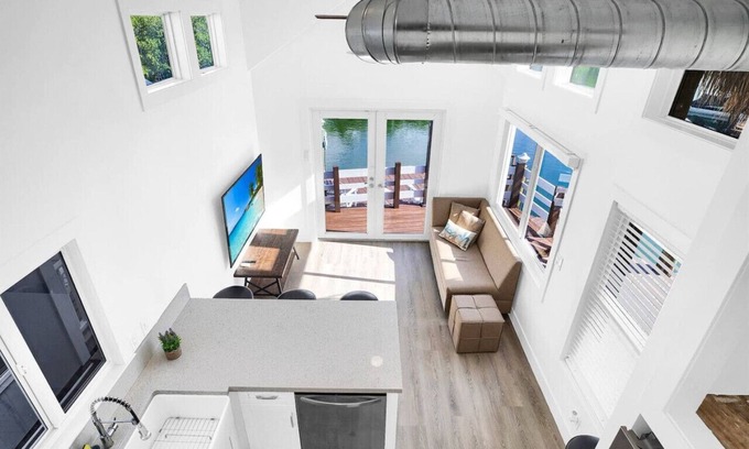 Your stay includes a variety of modern amenities designed to ensure comfort and convenience. The tiny home accommodates up to six guests, featuring one bedroom and a double loft with three queen-sized beds. Enjoy cooking in the fully-equipped kitchen or take your meals outside to the sheltered picnic area beside the water. Unwind in the open living space furnished with plush seating and large flat-screen TVs. Spend leisurely afternoons at the community swimming pool or explore the bay with complimentary kayaks and paddleboards. The property also boasts a tiki bar for mixing drinks and socializing after a day of adventures.