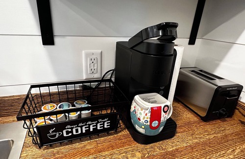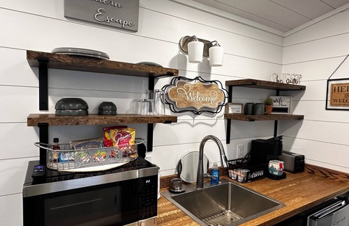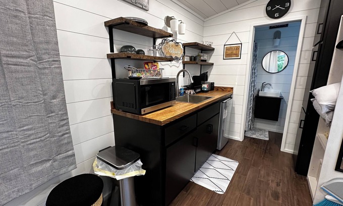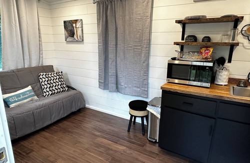 This custom built tiny home on wheels includes a Queen size bed with memory foam mattress. There is no bedroom, it is a studio design. The kitchen area includes a versatile microwave that also functions as an air fryer, convection oven, and broiler. You'll find a Keurig coffee maker, toaster, plates and utensils. We provide all linens, including sheets and towels, so you can arrive worry-free and ready to enjoy your stay at Modern Escape!