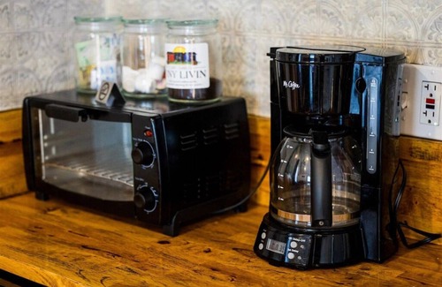 KITCHEN: Features mini oven, plenty of counter space, a sink (no dishwasher), a fridge, coffeemaker. The kitchen is equipped with all the basics to cook a full meal, as well as 2 place settings. Coffee, creamer and sweeteners. A charcoal grill is also provided outside for guest use.