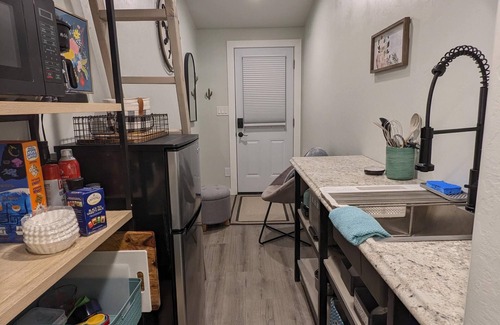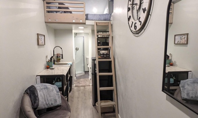 It is a great place to crash if you are going to be out and about all day and just need a cozy place to lay your head and maybe cook simple meals. Complete with a full bathroom, efficient kitchenette, and loft bed. This tiny house is attached to the guest house, Casita C, and has a shared courtyard. It is great for a single person, young couples, or older kids. This bunkhouse is close to downtown and the U of A campus.