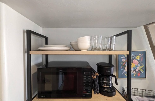 It has a kitchenette with a hot plate, toaster oven, microwave, coffee pot, and a small but decent size refrigerator. It has dishes, pots and pans, and a teapot.