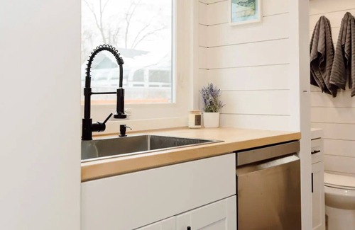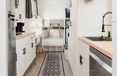 The tiny house itself offers bright modern style with a full kitchen, a bathroom with a full size shower, and a loft bedroom.