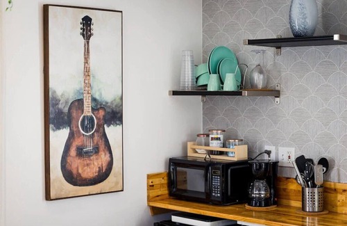 KITCHEN: Features microwave , plenty of counter space, a sink (no dishwasher), a mini fridge, coffeemaker. The kitchen is equipped with all the basics to cook a full meal, as well as 2 place settings. Coffee, creamer and sweeteners. A charcoal grill is also provided outside for guest use.
