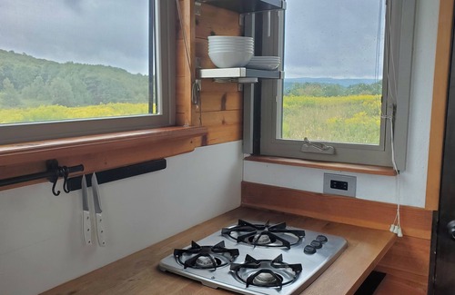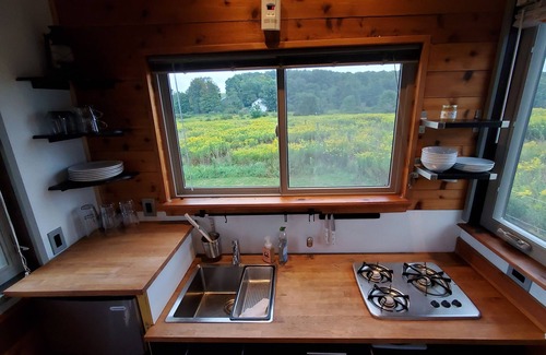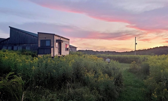 Go glamping in our custom-built tiny house surrounded by rolling meadows, open skylines, nights full of stars, and air scented with wildflowers. Our tiny house sits on 20 acres and features a queen bed, full kitchen and bathroom, wifi, AC, organic linens, walking trails, outdoor lounge space, and more! Enjoy first-rate amenities including a full kitchen, full bathroom with bathtub, queen-size loft bed, and a full-size fold-out couch for more guests. There is an ample living room to watch movies, play board games, or even relax in the hammock and read a good book. The desk for working folds away when you're ready to play. The bathroom has a composting toilet, a shower with a full-sized bathtub, and includes 100% organic cotton towels. Kitchen with refrigerator and freezer, propane range top, convection toaster oven, french press, and basic kitchenware. This is a chemical-free and low-fragrance stay! See details below. We also provide lounge spaces in our beautiful barn and outdoors, featuring picnic table, fire pit, and outdoor games. There's a walking trail through our chemical-free wildflower meadow, or lounge outside and enjoy views of our surrounding hills and neighboring lake. Details of the Tiny House Cabin features and property: Our custom tiny house was built with non-toxic materials including zero-VOC paint, sheep's wool insulation, and cedar cladding. The sheets and towels are 100% organic cotton (GOTS certified) and the rest of the bedding is either organic cotton or Oeko-tex Standard 100 certified, except one locally-made quilt! We wash all bedding in fragrance-free laundry detergent. We use no synthetic fragrances and have fragrance-free soap available. We offer clean toiletries and complementary snacks free of top-9 allergens. Feel free to ask for more details! Local Attractions: Our property is 20 minutes from the the National Baseball Hall of Fame, 16 minutes from Cooperstown Dreams Park, and 30 minutes from Glimmerglass State Park. The Hartwick/Cooperstown area offers many outdoor recreation opportunities including visiting local parks, hiking, biking, paddling, swimming, boating, and lakefront beaches. Local restaurants, breweries, and a cider mill offer great spots to have a meal out on the town. Shop locally for artisan crafts and antiques, visit the farmer’s market, or spend an afternoon at the pick-your-own blueberry farm down the road. Other things to know: This is a somewhat remote location, the internet can be spotty, and television streaming services or cell phone signals can be interrupted on occasion. For their safety we ask that children under 12 stay out of the loft area. Entrance to the tiny house requires the use of stairs, as does the loft to access the queen bed. In late summer and fall our meadow blooms with lots of goldenrod - some people think goldenrod causes seasonal allergies, but don't worry, this is a misconception! Seasonal allergies are usually caused by ragweed, as goldenrod's pollen isn't wind-born. If you are visiting with a pet, please keep her/him on a leash outdoors as the property is not fenced.