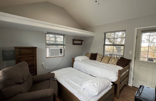 Peaceful serene surroundings nestled on top of a hill away from the hustle and bustle! Tiny cozy house with a TV and a small kitchenette- with a refrigerator-toaster oven- and a hot plate and a microwav.