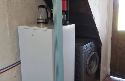 - on the ground floor there is a kitchenette with the necessary for drinking coffee and cooking, a fridge-freezer, a washing machine, a large wood stove (with free wood) and a salon with a (sleeep)sofa.