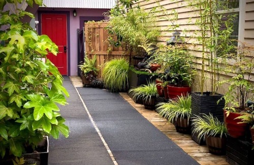 This 288 sq. ft. studio is stylishly decorated and very comfortable with a queen size daybed, stocked kitchenette, smart TV, Wi-Fi and a floating wood countertop for dining, working or hanging out. It has a new mini split air conditioner with heat pump to keep you comfortable year round. The large bathroom has a brand new large tiled shower with a mural. The entrance draws you along a potted garden filled with bamboo, vines and ferns leading to a lovely shared covered deck area with seating and a fountain where you can unwind. The unit is through a gate and up a few stair steps from there with a cozy private deck, a café table and chairs.
