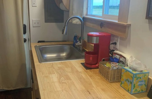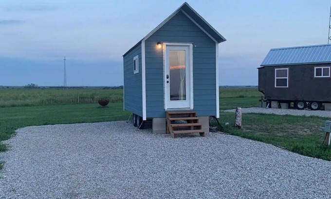 Enjoy the cozy experience of staying in an authentic tiny house. Immerse yourself in the unique charm of rural Kansas, picturesque farmland & open skies - perfect for stargazing. This tiny space features self checkin, a queen-sized bed, loft with a full-sized bed, smart TV, Wi-Fi, an electric fireplace & kitchenette with mini fridge, microwave, induction stovetop & coffee maker. Basic dishes & cooking supplies provided. Full bathroom comes stocked with towels, shampoo, conditioner & body wash.