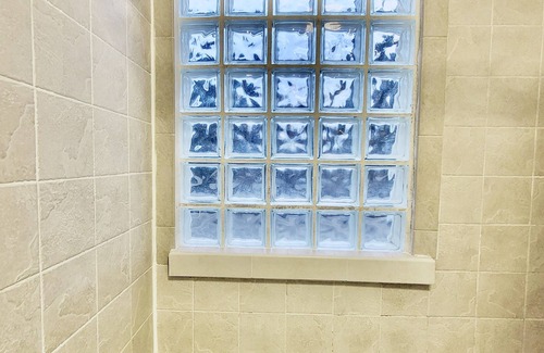 A full bathroom is located off the bedroom with a shower, tub, and toilet. Towels are provided.