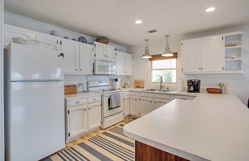 Kitchen: Fully Equipped Kitchen with White Appliances, Dishware/Flatware, Silverware, Serving Platters, Cutlery, Wine Glasses, Dishwasher, Stove/Oven, Refrigerator, Microwave, Keurig and Drip Coffee Maker, Blender, Toaster, Belgian Waffle Maker, Ice Maker, Spices, Oil, Coffee Filters, Plastic Storage Containers, Small Plastic Bags, Aluminum Foil, and More