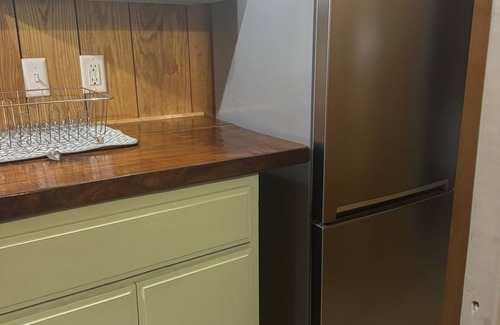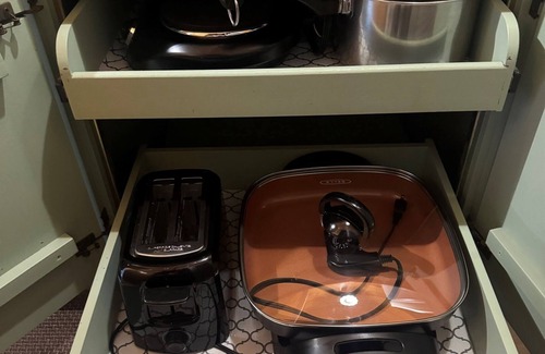 Eat: Kitchenette with air fryer, electric skillet, microwave, double burner electric hot plate, refrigerator with ice maker, blender, toaster, coffee bar and electric kettle