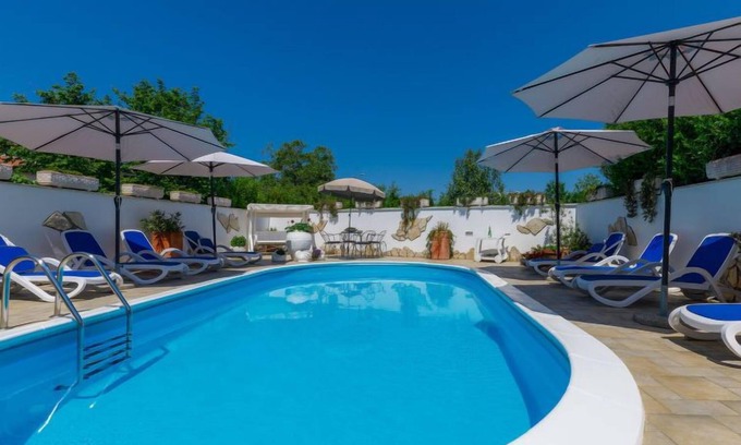 Beautiful 3-family house "Tiziana". In the district of Finida, 2 km from the centre, 2.5 km from the sea. For shared use: beautiful garden (fenced) with lawn and flowers, swimming pool (8 x 4 m, depth 140 cm, seasonal availability: 15.Apr. - 30.Sep.). Outdoor shower, barbecue. In the house: internet access. Parking at the house on the premises. Supermarket 1 km, restaurant 50 m, bus stop 1.7 km, pebble beach 4 km, shingle beach 2.5 km, public bathing area 2.5 km. Sports centre 4 km. Please note: Additional accommodations can be booked.