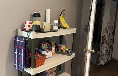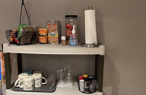 *The kitchenette is provided with a full-size refrigerator, microwave, coffee pot, toaster, blender, kitchen utensils, mugs, paper plates and bowls. There is also a variety of teas, coffee, snacks, breakfast items.