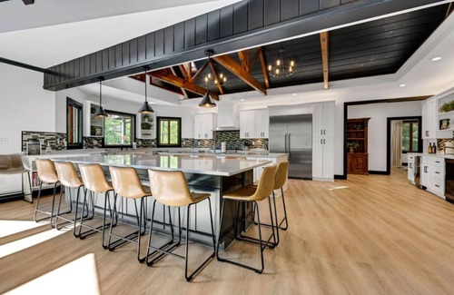 This luxurious lodge boasts a variety of upscale amenities designed to enhance your wedding experience. Accommodating up to 25 guests, it features 8 beautifully appointed bedrooms, ensuring comfort and privacy for your bridal party and family. Entertain your guests in the spacious living area complete with a floor-to-ceiling stone fireplace or host a rehearsal dinner in the newly renovated kitchen equipped with high-end appliances. The large deck overlooking the river is ideal for outdoor ceremonies and receptions, while additional facilities such as a game room and home theater provide fun activities for guests during downtime. Imagine toasting to your new life together in the hot tub surrounded by gorgeous natural scenery – it's all possible here.