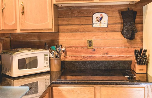 Two bedrooms each with a Queen-sized bed, Kids Loft with Twin over Full custom log bunk bed, Full-sized futon & Xbox 360, Full kitchen with refrigerator, stove and oven, dishwasher, Microwave, toaster and single-brew & full pot coffeemaker, Jacuzzi tub in main bedroom, Full bath with shower, Dining area, Guest phone, Roku TV with streaming service & DIRECTV, Heat & air conditioning, ceiling fan, Front porch with swing, Back porch with table, chairs, and Gas and Charcoal grill.
