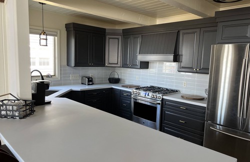 The home has a master suite on the main floor, with its own en suite full bath with 2 sinks and a walk in shower. There is an additional bedroom on the main floor with a twin over full bunk bed perfect for a kids room, but comfortable enough for an additional adult couple. The living room boasts a newly remodeled modern décor, fireplace, and open floor plan with a large dining area and kitchen. The dining table sits 8 with additional seating at the kitchen island. The kitchen is newly remodeled with high end appliances, solid surface counter tops and a large island for hosting and gathering. The kitchen is fully stocked with a four-burner gas stove, dishwasher, and all the amenities needed for some gourmet cooking.
