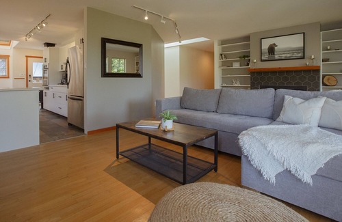 Our open-concept two bedroom home features a cozy living room with two sitting areas, 2 wood burning fireplaces to enjoy. One is located in the kitchen and provides the perfect ambiance while dining and the other is located in the living room. Newly renovated bathrooms which adds a modern touch to the home. The large master bedroom offers a king bed with a recently updated en suite bathroom. The master bedroom is spacious and bright and has a stand up desk nestled away for those that need to dive into work while travelling. The second bedroom has a queen bed and just down the hall is a shared bathroom that has a stackable washer and dryer. The living room is bright and spacious and has a queen size pullout couch to sleep an additional 2 guests. The kitchen is fully stocked with all the cooking utensils and dishes you would need to stay in and cook while on your getaway! If you are travelling with a baby, we have you covered as the property has a variety of kids toys and books, an infant bath, a baby rocking chair and pack and play with a bassinet attachment. Step out onto the large deck with a BBQ and patio table, and gather around while enjoying the beauty and tranquility of the West Coast.